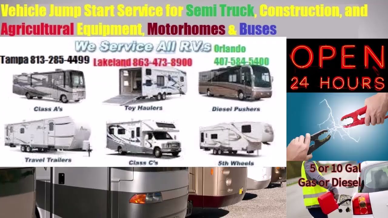Vehicle Jump Start Service for RV Motorhomes by A1 Battery Jump Start Service in Tampa, Lakeland and Orlando FL who need roadside for heavy duty 12/24v volt commercial fleet vehicle open 24/7 nearby mobile jumpstart. 24 hours Jump Start Service If you are around Orlando, Orange County, Sanford, Seminole County, Kissimmee, Osceola County, Clermont, Lake County 407-584-5400, Lakeland, Winter Haven, Polk County, Sebring, Avon Park, Highland County, 863-473-8900, Tampa, Brandon, Hillsborough County, St Pete, Clearwater, Pinellas County, Wesley Chapel, New Port Richey, Pasco County, FL 813-285-4499.
